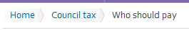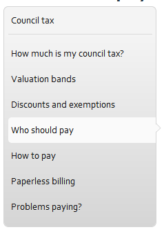When people get to the page with the task on, we have secondary navigation. This is so people can move around the section of the site they are in. So when you’re looking at council tax bands, you can quickly get to discounts and exceptions, but on a large site, to keep the secondary nav small and focused, we only really show you the bit of the site you are in. It’s a bit like a breadcrumb trail…. oh, yeah.