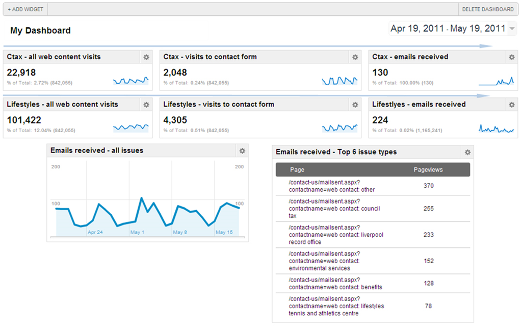 Another measure that you might choose to include is contact rates. the ability to measure of contact rates was built into the design of liverpool.gov.uk – users have to click through to telephone numbers, and addresses – which gives the city the ability to measure contact from any section of page of the site.