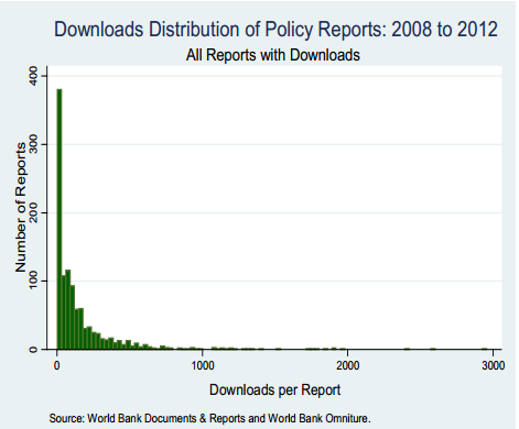 A recent report by the World Bank, looking at the number of downloads of reports from their own site, is making the news. Looking at their statistics they found that nearly 1/3 of the reports on their website had never been downloaded, with a further 40% getting less than 100 downloads. At the other end of the spectrum, only 2% of the reports on their website have had over 1000 downloads. This is the typical “Long Neck“ (albeit on its side, in the World bank graphs) that you see, not only for downloads, but also for page views, on many sites.