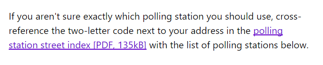 A lot of councils provide a list of polling places/stations, in PDF format. This document quite blatantly comes out of some electoral system and whilst it was probably very useful to the people who created it, it solves very few if any of the voter’s problems.